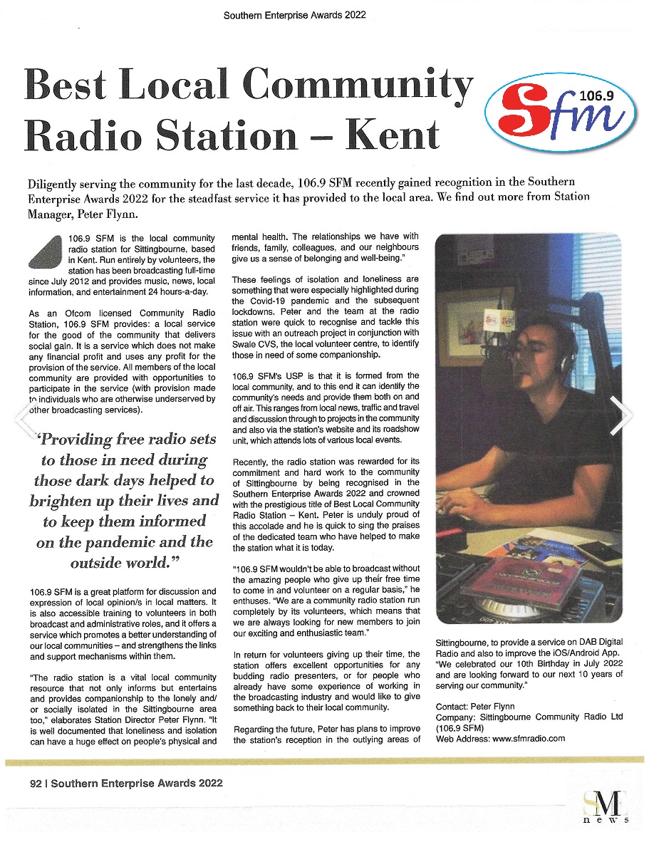 The team here at 106.9 SFM have been named 'Best Local Community Radio Station - Kent' in The Southern Enterprise Awards for 2022.
