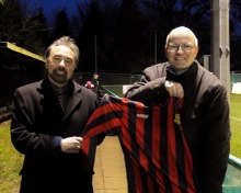 The photograph shows Sittingbourne FC secretary John Pitts presenting one of the shirts to Julian Chenery a representative from the foundation.